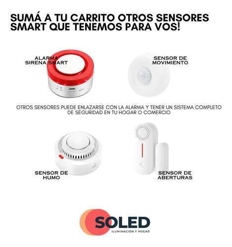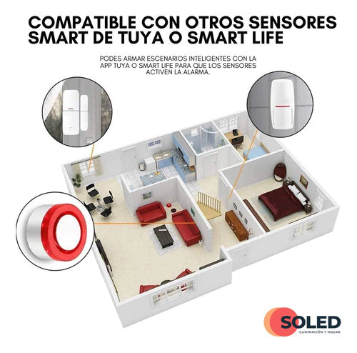 Podes enlazar la alarma con sensores de movimiento o aberturas, como tambien sensores de humo o monóxido de carbono. Mientras los sensores trabajen con SmartLife, Tuya o Alexa, es posible armar diferentes escenarios smart para tu hogar o comercio.